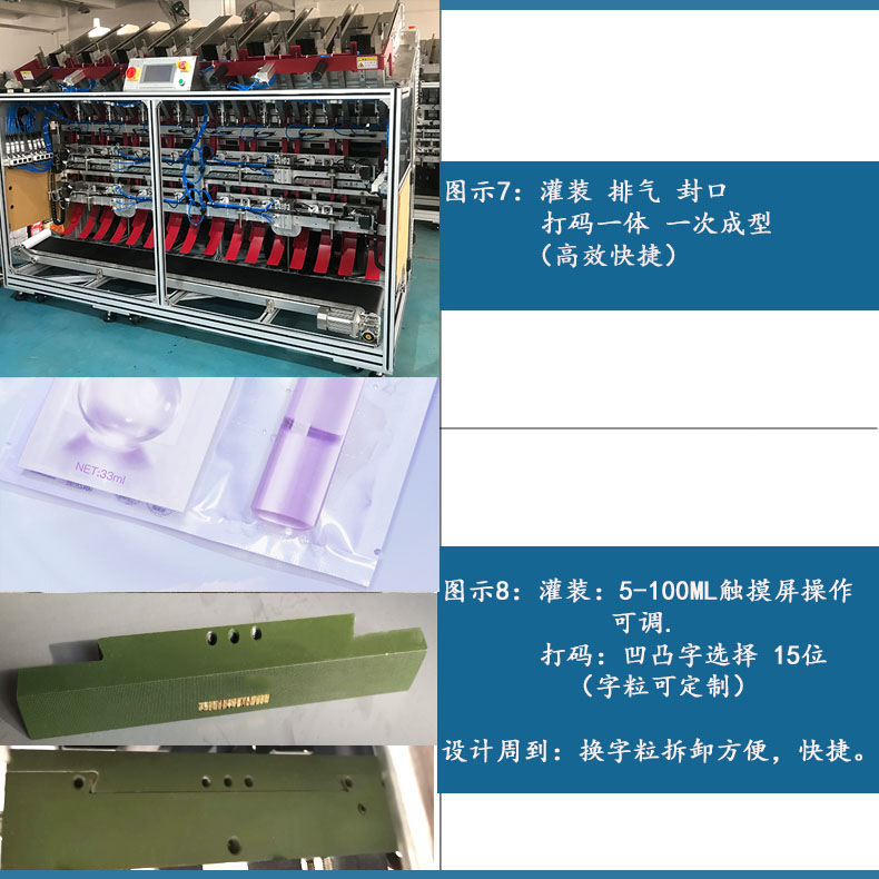 動作流程 Working Procedure | 自動下袋、自動充填、自動封口、打碼、成品輸出 Automaticbag feeding, liquidfilling, sealing, date coding and finish bag out feeding |