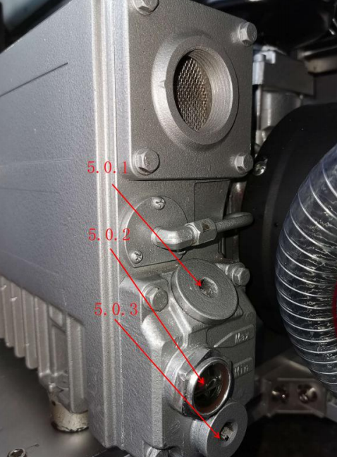 定期觀察有油真空泵的油位 5.0.2,要保證油位在 MIN 與 MAX 之間;一般每半年換一次真空泵油,更換真空泵油時,先松開 5.0.3 放油螺栓,把里面的廢舊真空泵油放掉,再鎖緊放油螺栓,然后松開5.0.1 注油螺栓,把真空泵油從此加入,加至油位在 MIN 與 MAX 之間,一般的,當油位低于 MIN 刻度線時,只需要增加真空油至油位在 MIN與 MAX 之間即可。